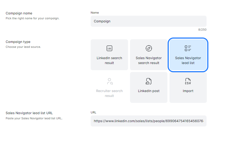 - Once you’ve filled your list with leads, it’s time to set up your campaign! Copy the URL of your Leads List, paste it into the designated area in the ROVER, and give your campaign an awesome name.