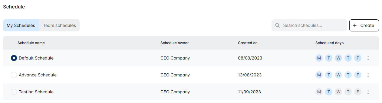 Click on the 'Create' button to open a new window for schedule creation.