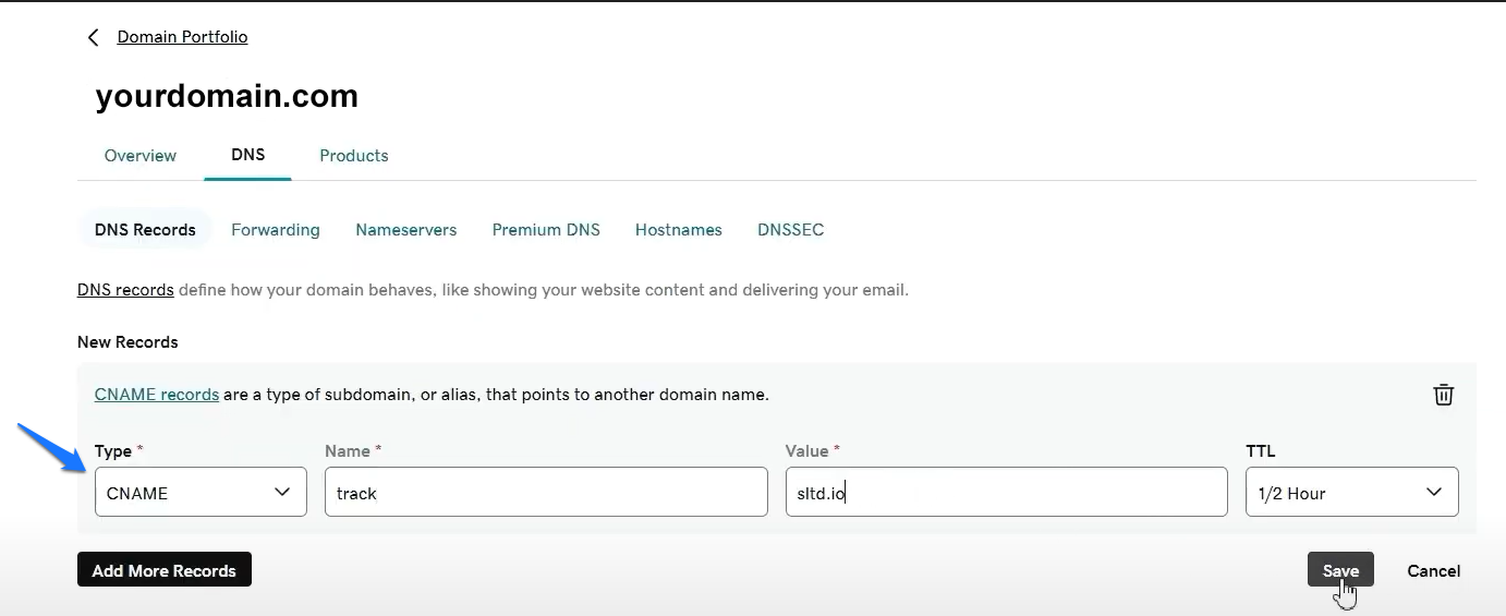 - This time, under record type in the dropdown menu, find CNAME, and paste the details provided in ROVER’s Custom tracking domain settings.