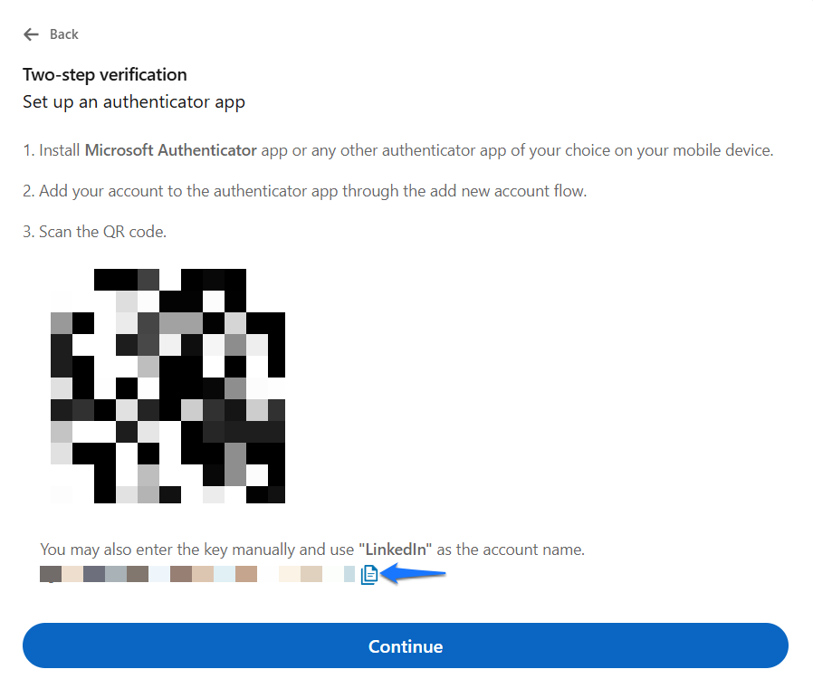 - LinkedIn will show a QR code — scan it with your authenticator app