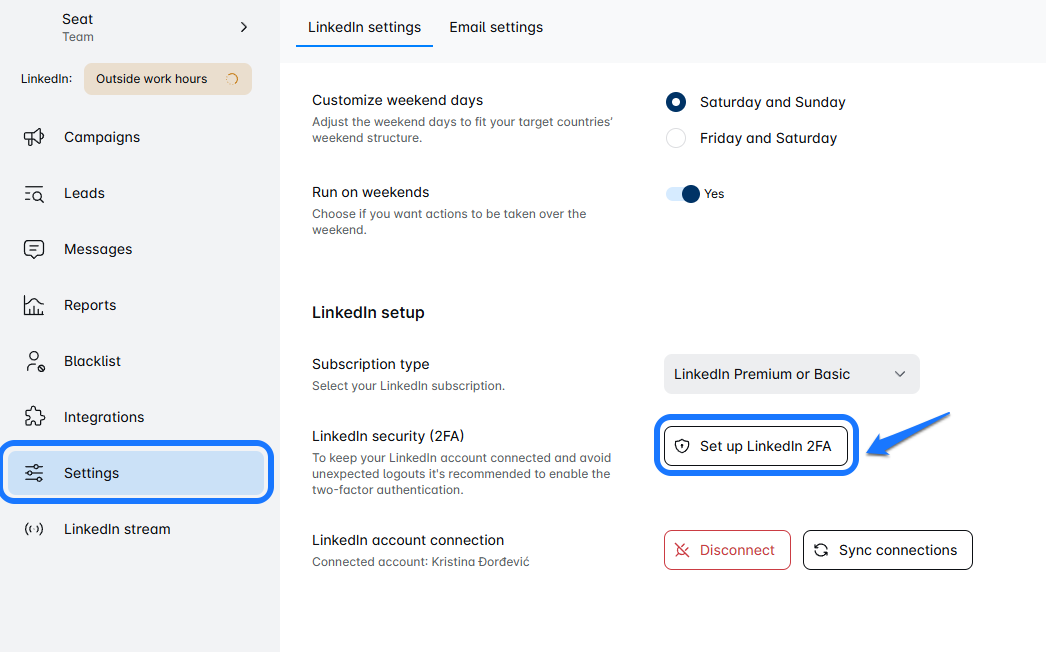 1. Open LinkedIn 2FA Settings in leadROVER ⚙️
